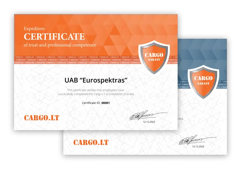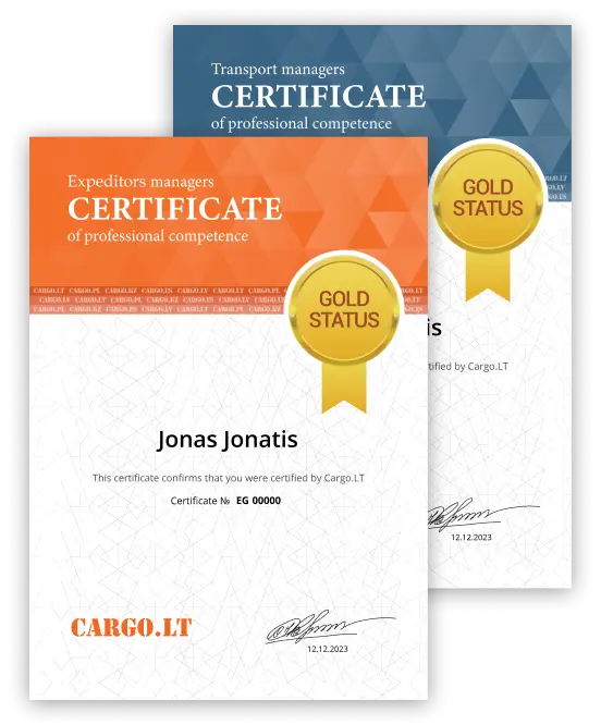 Įmonių ir vadybininkų sertifikatai patvirtina Cargo.LT vartotojų žinias ir patirtį logistikoje.