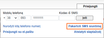 Kodą iš SMS žinutės, kurią gausite, reikia įvesti lauke Kodas iš SMS, ir paspausti mygtuką Įeiti.