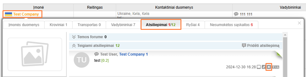Užeikite į įmonės paskyrą (kataloge) ir perekite į aplanką Atsiliepimai, suraskite savo ir spauskite mygtuką Pašalinti.
