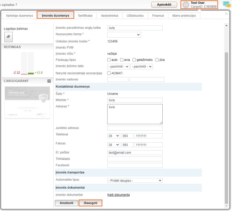 Norėdami pakeisti įmonės kodą, įmonės ID ar pavadinimą, kreipkitės į svetainės administratorių: info@cargo.lt.