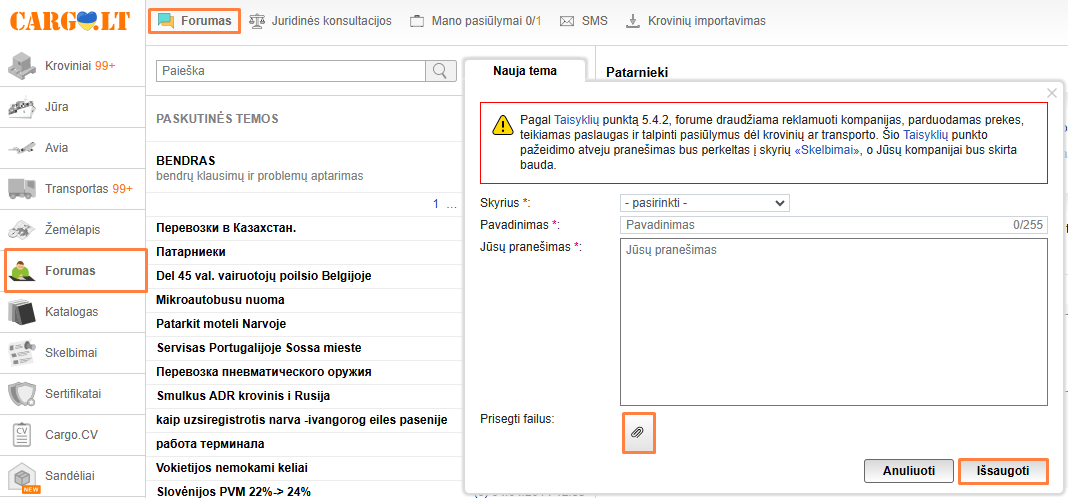 Tam, kad sukurtumėte naują temą, pereikite į skiltį Forumas ir spauskite mygtuką Nauja tema
