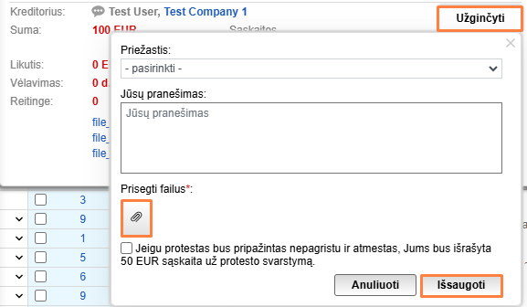 Jei norite užginčyti neapmokėtą sąskaitą faktūrą, eikite į Neapmokėtų sąskaitų faktūrų poskyrį svetainės meniu ir spustelėkite Ginčyti. Atsidariusiame lange užpildykite informaciją, pridėkite patvirtinamuosius dokumentus ir spustelėkite mygtuką Išsaugoti. Informaciją apie protestą peržiūrės svetainės administratorius.