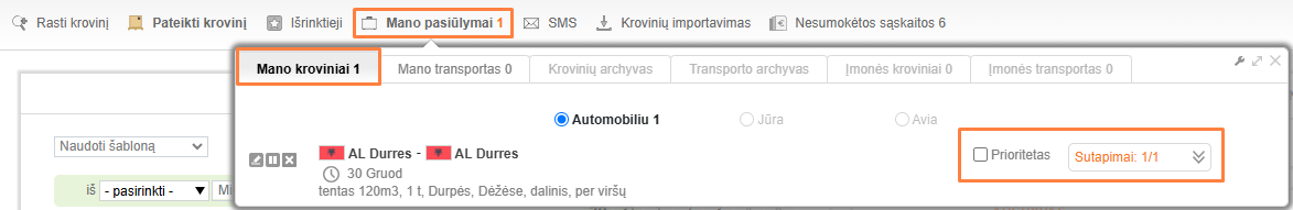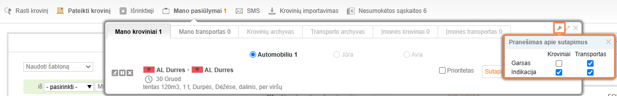 Pridėjus krovinį / transportą, sistema automatiškai suranda sutapimus mūsų svetainėje.