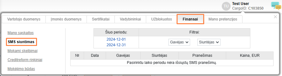 Norėdami peržiūrėti ataskaitas apie išsiųstas SMS, mokamus skelbimus ir specialius pasiūlymus, prisijunkite prie Vartotojo profilio, eikite į skyrių Finansai ir spustelėkite atitinkamą skyrių (Mano paskyros, SMS siuntimas, mokami skelbimai, Specialusis pasiūlymas, Mano sutartys).