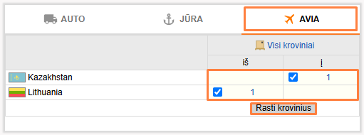 Norėdami surasti avia krovinius per bendrą lentelę, nueikite į Pagrindinį puslapį ir paspauskite mygtuką Avia.