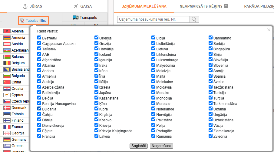 Ja vēlaties redzēt tikai valstis, ar kurām jūs strādājat, dodieties uz apakšsadaļu Tabulas filtrs un noņemiet ķeksīšus no tām valstīm, kuras nevajadzētu rādīt.