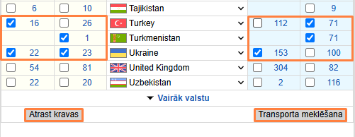 Lai meklētu kravas, izmantojot vispārējo tabulu, dodieties uz Galveno lapu, atzīmējiet ar ķeksīšiem iekraušanas / izkraušanas punktus tabulā un noklikšķiniet uz Atrast kravas.