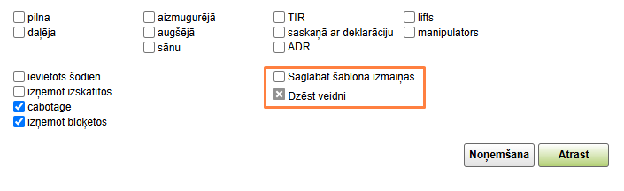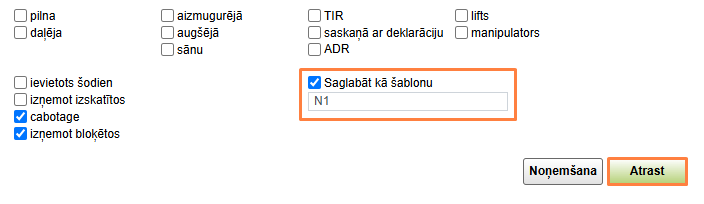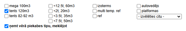 Izvēloties vienu transporta veidu, ir jāatzīmē izvēles rūtiņu Ņemt vērā piekabes tipu, meklējot.