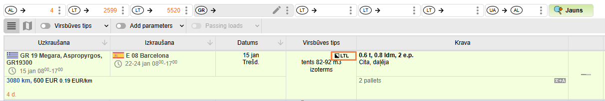 Kravas no citām transporta biržām. Cargo un Teleroute ir parakstījuši līgumu par sadarbību un datu bāzu apmaiņu, tāpēc, meklējot kravu, jūs varat redzēt šādu ikonu pie dažiem rezultātiem: TLR. Lai skatītu uzņēmuma kontaktus, kas publicējis savus piedāvājumus Teleroute, noklikšķiniet uz tā nosaukuma, lai sekotu ārējai saitei.