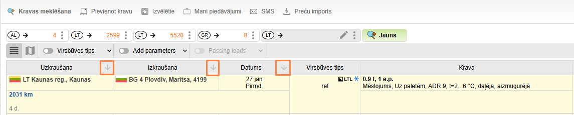 Meklēšanas rezultāti tiks parādīti cilnē tabulas veidā, kurus var kārtot pēc alfabēta (iekraušanas, izkraušanas punkti, klienti), kā arī pēc datuma.