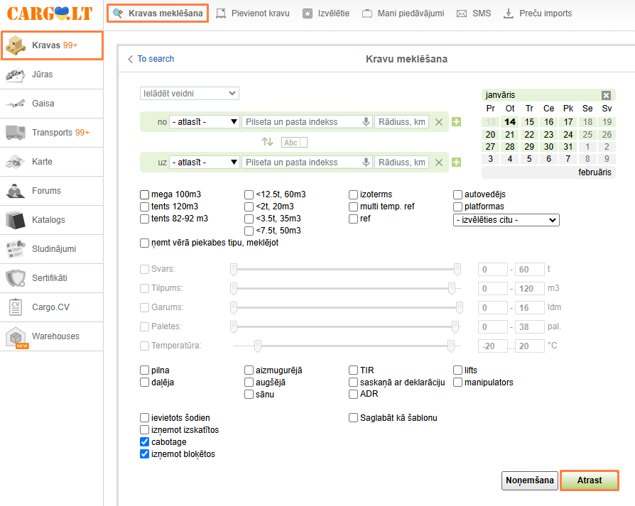 Dodieties uz sadaļu Kravas, noklikšķiniet uz Atrast kravu un meklēšanas formā aizpildiet nepieciešamos parametrus, un pēc tam noklikšķiniet uz Atrast.