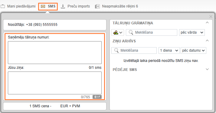 Lai nosūtītu īsziņu no vietnes, dodieties uz apakšsadaļu SMS , ievadiet vienu vai vairākus tālruņus laukā Saņēmēju tālruņa numuri, ierakstiet tekstu ziņojuma laukā un nosūtiet, noklikšķinot uz Enter.