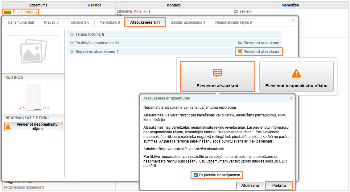 Cargo.LT negatīvo atsauksmi var atstāt tikai tad, ja tiek augšupielādēti dokumentus, kas apliecina pārvadājumu un pretenzijas (līgums, pārvadājuma pasūtījums, rēķins, ekrāna attēli ar saraksti utt.).