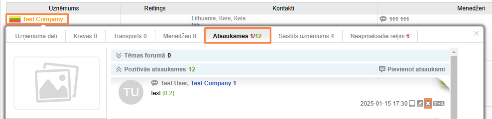 Dodieties uz uzņēmuma profilu (katalogā) un uz cilni Atsauksmes, atrodiet savu atsauksmi un noklikšķiniet uz ikonas Dzēst.