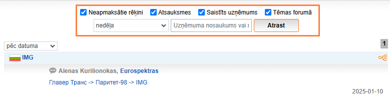 Jūs varat kārtot notikumus pēc datuma vai uzņēmuma; filtrēt pēc pozīcijām (Neapmaksātie rēķini, Atsauksmes, Saistītie uzņēmumi, Tēmas forumā) un perioda (3 dienas, nedēļa, mēnesis), kā arī atrast informāciju par konkrētu uzņēmumu pēc tā nosaukuma vai koda.