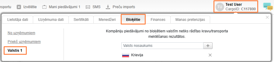 Lai paslēptu dažu valstu uzņēmumu piedāvājumus, meklējot kravu vai transportu, noklikšķiniet uz sava vārda, dodieties uz Lietotāja profilu, pēc tam uz cilni Bloķētie. Kreisajā slejā noklikšķiniet uz Valstis. Ievadiet valsts nosaukumu. Kravu / pārvadājumu meklēšanas rezultātos netiks parādīti bloķēto valstu uzņēmumu piedāvājumi.