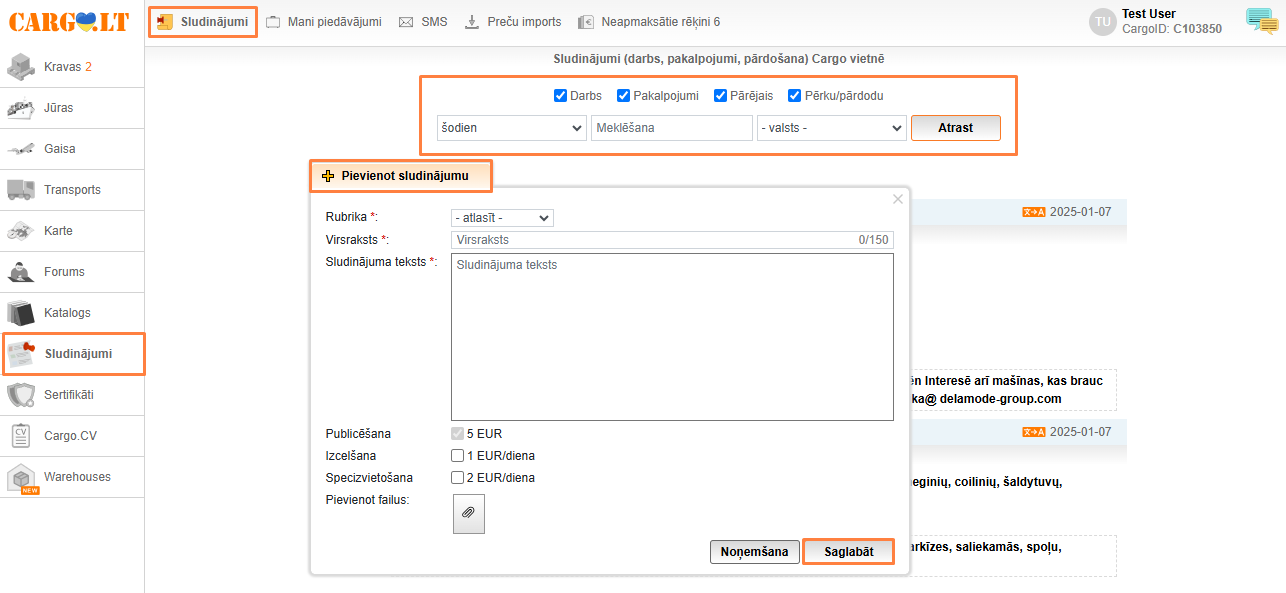 Lai pievienotu reklāmas sludinājumu, dodieties uz sadaļu Sludinājumi un noklikšķiniet uz Pievienot sludinājumu. Atvērtajā logā aizpildiet informāciju, pievienojiet failus un noklikšķiniet uz pogas Saglabāt.