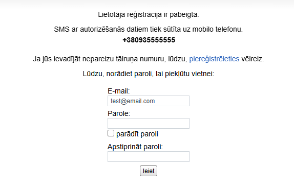 Pēc reģistrācijas pabeigšanas uz reģistrācijas laikā norādīto numuru, tiks nosūtīts īsziņa ar ievadāmu kodu.