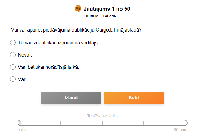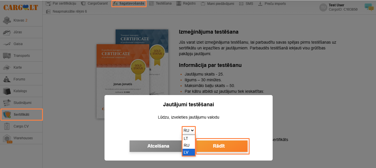 Lai sāktu izmēģinājuma testēšanu, noklikšķiniet uz pogas Sākt testēšanu. Izvēlieties valodu un noklikšķiniet uz Sākt. Jums ir jāatbild uz 25 jautājumiem 30 minūšu laikā.