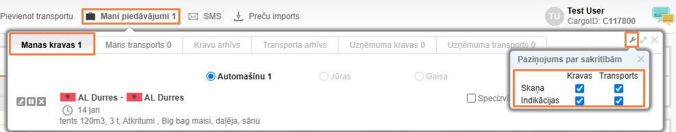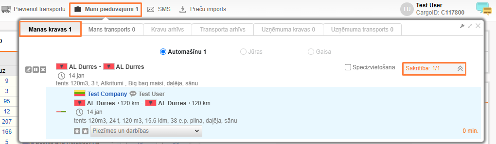 Kad esat pievienojis savu kravu / transportu, sistēma automātiski atrod sakritības mūsu vietnē.