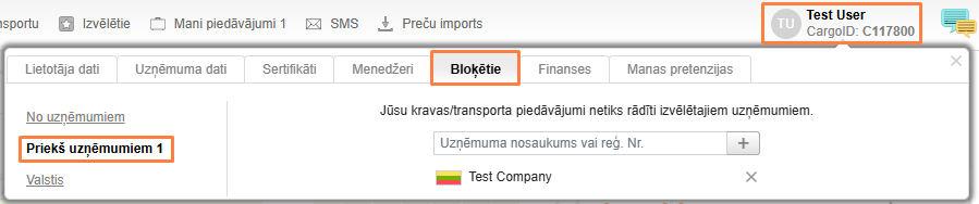 Lai paslēptu savus piedāvājumus no dažiem uzņēmumiem, meklējot preces vai transportlīdzekļus, noklikšķiniet uz sava vārda, dodieties uz Lietotāja profilu, pēc tam dodieties uz cilni Bloķētie. Kreisajā slejā noklikšķiniet uz Priekš uzņēmumiem. Ievadiet uzņēmuma nosaukumu vai kodu, kuram netiks rādītas jūsu piedāvājumi kravas / transporta meklēšanas rezultātos.