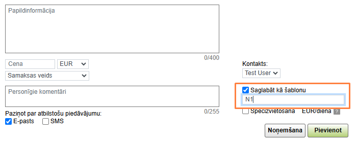 Lai samazinātu laiku, kas ir nepieciešams, lai pievienotu vienus un tos pašus kravas / transporta piedāvājumus, varat izveidot šablonu. Lai to izdarītu, pievienošanas režīmā izvēlieties Saglabāt kā šablonu, norādiet nosaukumu un noklikšķiniet uz Pievienot.
