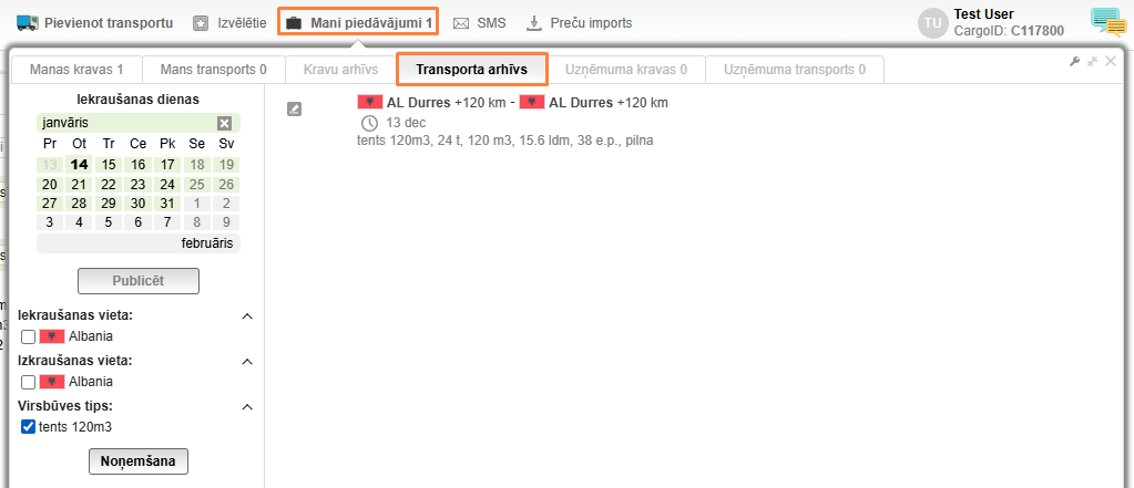 Piedāvājumus, kurus jūs iepriekš publicējāt, var atjaunot no kravu / transportu arhīva. Arhīvs atrodas sadaļā Mani piedāvājumi, Kravu arhīvs / Transporta arhīvs.