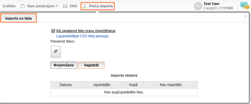 Lai importētu kravas, izmantojot failu, dodieties uz sadaļu Kravu imports galvenajā lapā, un cilnē Importēt no faila pievienojiet failu un pēc tam noklikšķiniet uz Saglabāt.