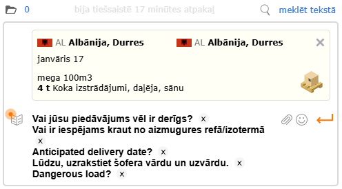 Tiek atvērts Cargo.Messenger. Informācija par maršruta un kravas / transporta parametriem, kā arī izvēlētās šablona rāzes, kuras pēc noklusējuma tiek nosūtītas, ja tiek pieprasīta krava vai transports, tiks automātiski ievadītas teksta ievades laukā. Noklikšķiniet uz ikonas Nosūtīt.