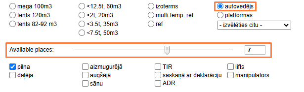 Izvēloties transportlīdzekļa tipu “autovedējs”, pietiek norādīt tikai brīvo iekraušanas vietu skaitu.
