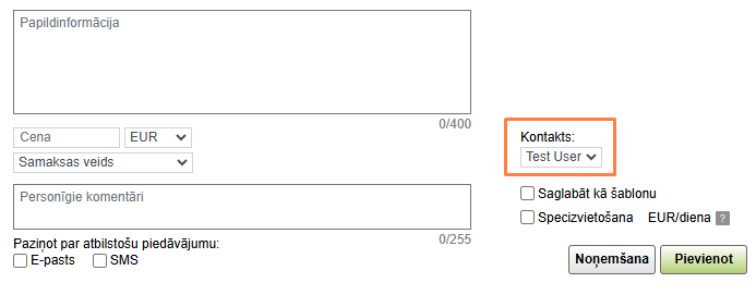 Kontakts. Automātiski esat norādīti jūs. Ja nomainīt jūsu kontaktu uz citu uzņēmuma darbinieku (no nolaižamā saraksta), tikai viņš varēs redzēt un rediģēt / dzēst šo pievienoto piedāvājumu.