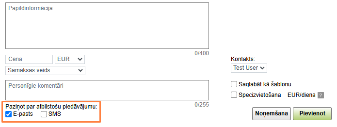 5. Paziņot par atbilstošu piedāvājumu. Ja vēlaties saņemt paziņojumu par atbilstošu piedāvājumu, izvēlieties vēlamo metodi: e-pastu vai SMS. SMS paziņojums ir maksas pakalpojums.