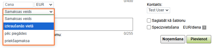 6. Samaksas veids. Noklikšķiniet uz Vairāk parametru… Izvēlieties nepieciešamo samaksas veidu no piedāvātajiem: izkraušanas vietā, pēc piegādes vai priekšapmaksa. Norādiet cenu.