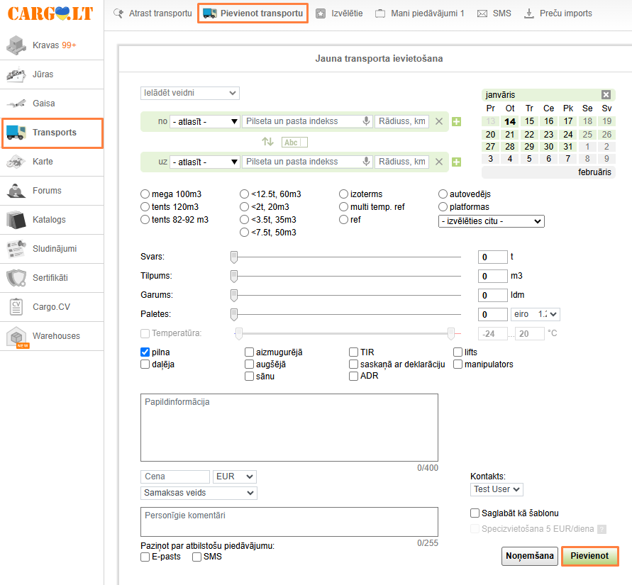 Lai pievienotu transporta piedāvājumu, dodieties uz sadaļu Transports, noklikšķiniet uz Pievienot transportu
